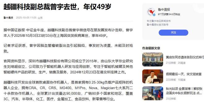 越疆科技副总裁曾宇去世,年仅49岁 鲁中晨报 2025-10-05