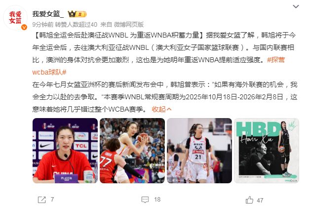 至于国内媒体人我爱女篮也报道,韩旭将于全运会后,前往澳大利亚征战WNBL,也是为她明年重返WNBA提前适应强度。